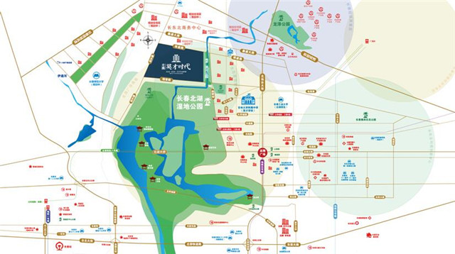 龙腾·英才时代位于湖畔街与锦普路交会,据守湖畔街生态金轴线,南临北湖湿地公园,东环滨河水系公园,步行即达植物公园(建设中)及2021年住建部重点打造项目—花海公园(建设中),在生态方面,是市内真正的富氧生活环境。也是唯一直面北湖公园的项目,与北湖公园隔街相望,让开门见园,推窗观湖成为现实(据北湖科技新区最新规划,未来将持续对北湖公园进行升级改造,将打造成服务全市的城市级居民最佳休闲娱乐配套)。在教育方面,周边优教资源丰富,与吉大英才、崇文学校(英才分校)等名校为邻。在商业方面,与项目直线距离仅约1.3公里,已规划25万平(中土北纬43°)综合体,是集商业、写字间、儿童教育等多元业态。目前区域24万平北湖吾悦广场已投入使用,两大商业是业主家门口的休闲、娱乐、购物一站式消费场所。